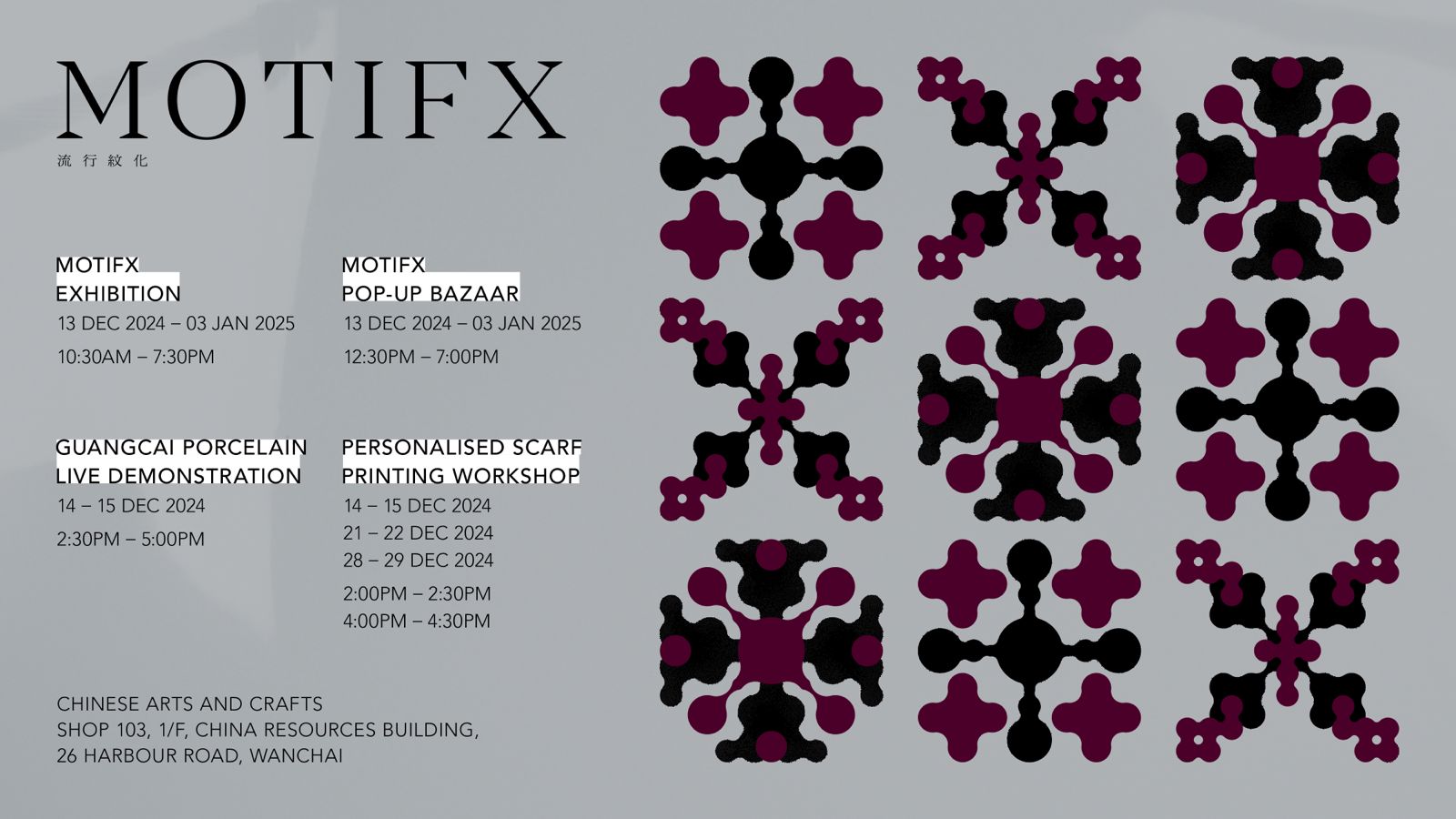 Motifx 邀請新生代設計師揉合中國傳統紋樣於當代設計,重新演繹這些文化底蘊深厚的經典圖案,並透過創新設計,將經典花紋元素融入於生活應用之中。 希望透過一系列精心策劃的活動,藉著與設計師、工藝師及文化專家合作,展開一場出歷史文化與現代美學之間的對話,探索傳統花紋在品味家居和日常生活中的獨特韻味。
